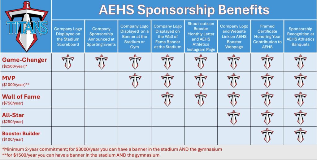 Your yearly sponsorship supports badly needed resources for the athletic programs at AEHS such as: